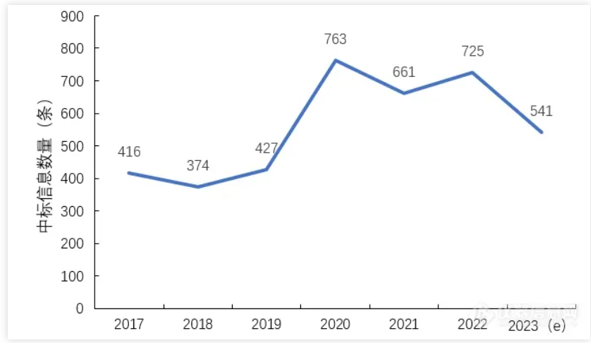 2017年-2023年荧光定量PCR仪中标信息统计从2017年-2023年荧光定量PCR仪的中标信息统计数据中可知,前疫情时代荧光定量PCR仪的中标数量走势基本稳定,平均每年中标406条,2020年-2022年荧光定量采购需求大涨,平均每年中标716条,与前三年平均中标数量相比增长了76.35%,且荧光定量PCR仪与PCR仪的需求变化一致,这表明疫情期间PCR仪的市场需求主要来自荧光定量PCR仪。后疫情时代,荧光定量PCR仪的市场需求下滑,较2022年下降了25.38%,但较2019年增长了26.70%。